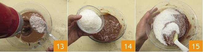 Now take the egg mixture and add the dry ingredients one spoon at a time, keeping the mixer running 13. When the dry ingredients are well incorporated, add the desiccated coconut 14 and mix with a spatula from the bottom up to combine everything 15.