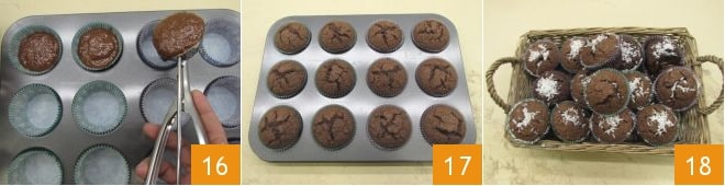 Line a muffin tin with paper liners, then fill them with the batter leaving about 1/2 inch from the top 16. Bake in a preheated static oven at 340°F for 20 minutes, then take them out and let them cool 17. Finally, garnish with a sprinkle of shredded coconut: your coconut and chocolate muffins are ready to be enjoyed 18!