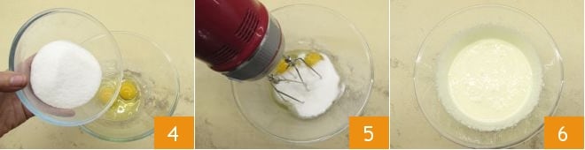 add the sugar 4 and mix with an electric mixer 5 until you get a soft and frothy mixture 6.
