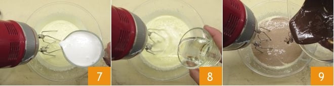 Pour the coconut milk and start mixing again at a lower speed 7, then add the vegetable oil 8 and finally the melted chocolate 9.