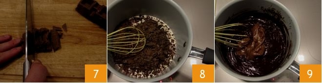 Now prepare the truffles. Finely chop the chocolate 7 and add it to the hot cream 8, stirring it with a hand whisk to melt it 8. Once you have a smooth mixture, blend the Nutella into the chocolate 9.
