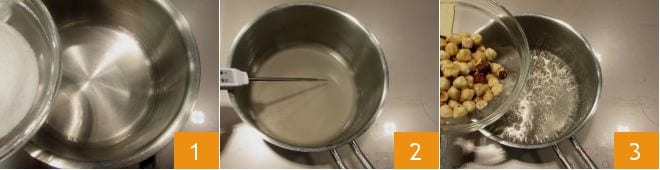To make the coconut and Nutella truffles, you first need to caramelize the hazelnuts. In a saucepan, combine the water and sugar 1, turn on the heat and, using a candy thermometer, bring the caramel to a temperature of 241°F 2. Turn off the heat and immerse the whole hazelnuts 3.