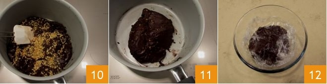 Now add the chopped hazelnuts 10 and mix until you get a substantial dough 11. Transfer the resulting dough into a bowl, covering it with cling film 12. Let it cool in the refrigerator for about 30 minutes.