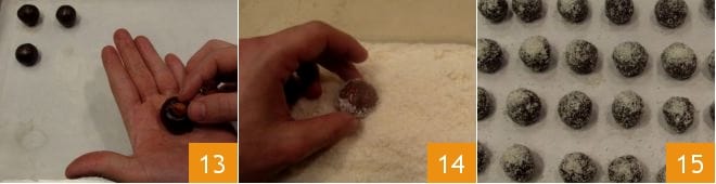 After this time, you can assemble the sweets. Divide the dough into 32 pieces, place a hazelnut in the center, and close it to form the heart of the dough. Then, using your palms, shape the truffles into spheres; as you make them, arrange them on a tray lined with parchment paper 13. Spread the coconut powder on a tray and dip one truffle at a time, ensuring the coconut adheres well to fully cover the surface of the truffles 14. Your coconut and Nutella truffles are ready 15: serve them in small paper cups.