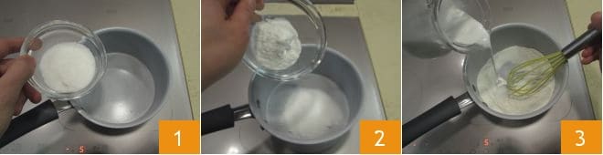 To prepare the coconut milk cream, start by pouring the sugar 1 and the rice flour 2 into a saucepan. Then gradually add the coconut milk, stirring continuously with a whisk 3.