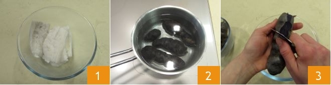 To prepare the creamed cod with yogurt and purple potatoes, you can use fresh cod fillets to boil until they turn white and tender, which will take about 10 minutes from boiling 1; alternatively, you can use frozen ones following the same method. Place the potatoes in cold water and cook for about 15 minutes from boiling. Then drain and peel them, being careful not to burn yourself 3.