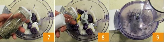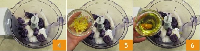 In a blender, add the cod and the peeled purple potatoes roughly cut into pieces 4 along with the grated lemon zest (keep a small portion aside for final decoration) 5 and the extra virgin olive oil 6.