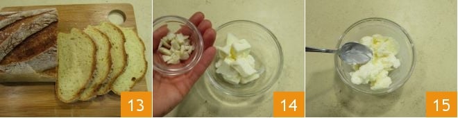 Cut 4 slices of rustic bread 13, then take the butter softened at room temperature and work it into a soft paste in a small bowl. Add the peeled and minced garlic 14 and mix 15.
