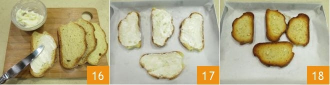 Spread the garlic butter on the slices of bread 16, then place them on a baking tray lined with parchment paper 17 and toast the slices in a preheated static oven at 392°F for about 17 minutes until they are well browned 18.