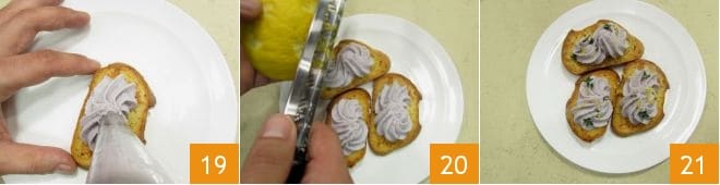 Serve your creamed cod mousse with yogurt and purple potatoes on the toasted bread 19, sprinkle with lemon zest 20, and add a few thyme leaves 21.