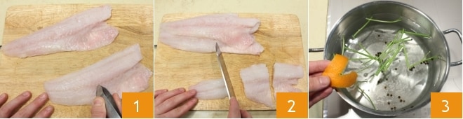 To make cod flans on artichoke cream, start by removing any bones from the cod fillets with kitchen tweezers 1, then cut the fillets into pieces 2. Fill a pot with water for steaming, flavor the water with parsley stems, black peppercorns, and two pieces of orange zest 3.