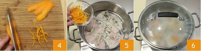 Julienne the remaining orange zest 4; bring the water to a boil, then place the basket in the steamer, lay the cod, chopped herbs, and add the orange zest 5. Cover with the lid 6 and cook for a maximum of 5 minutes.