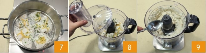 Once cooked 7, transfer the fish to the mixer 8 and mince it until you get a cream: if it's too dry, add a little hot water 9; transfer the resulting cream to a bowl.