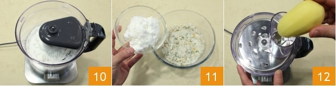 Separately, beat the egg white until stiff using a mixer with electric whisks 10. Incorporate the egg white into the cod 11 and mix to combine the ingredients. At this point, peel the potatoes, then slice them with a food processor fitted with slicing blades 12: