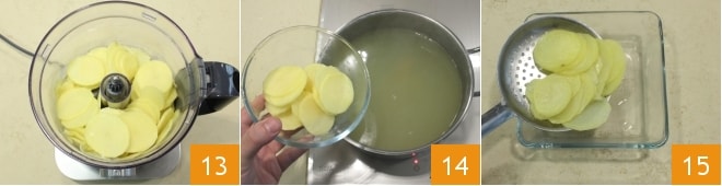 you should obtain very thin slices 13. Cook the potatoes in boiling water for a few minutes 14, they shouldn't fall apart, drain them 15 and set them aside.