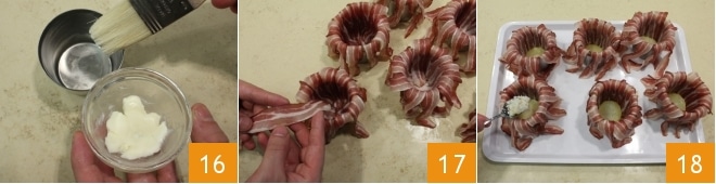 Butter individual molds with a capacity of 1/2 cup 16, line them internally with bacon slices 17 that should hang over the outer edge. Fill with a teaspoon of cod cream 18