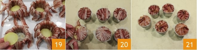 continue with a potato slice 19 and proceed until you run out of ingredients, alternating layers for all the pies. Then close with the bacon slices 20 and bake the pies in a preheated static oven at 350°F for 20 minutes (or in a fan oven at 320°F for 15 minutes). Once cooked, remove the pies from the oven and let them cool slightly 21.
