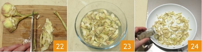 While the pies are cooking, prepare the artichoke cream: clean the artichokes, remove the tip and the outer leaves and remove the more fibrous layer of the stem. Thinly slice the artichokes 22 and soak them in a bowl with water and lemon to prevent browning 23. Then drain the artichokes and sauté them in a pan with a drizzle of olive oil and a clove of garlic until soft. Before turning off the heat, season with salt and pepper to taste 24.