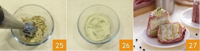 Blend the cooked artichokes with an immersion blender 25 until you obtain a cream 26 (you can add a little hot water to dilute it if the cream is too thick). At this point, you can unmold the cod flans onto a serving plate and garnish them with dollops of artichoke cream, made with a pastry bag fitted with a star nozzle 27! You can serve the rest of the artichoke cream as a side.