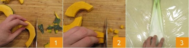 To make the cod in leek leaf, take the pumpkin and cut it into slices, remove the peel 1, then cut it into cubes about 1 cm 2 and set aside. Get 2 sheets of parchment paper for oven cooking, lay one sheet on a work surface, then slit the leek lengthwise and peel it, remove the outermost leaves and choose two leaves large enough to wrap the cod. Take a leek leaf, wash it, dry it, and lay it on the parchment paper 3,