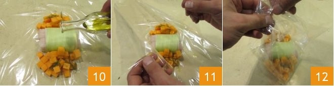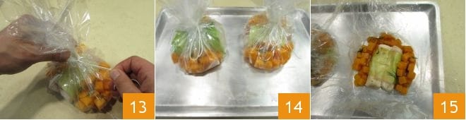 and wrap a string around 13 so that it remains well sealed. With the indicated quantities, you will obtain two bundles, place them on a baking tray 14 and bake in a preheated static oven at 375°F for 35 minutes. After cooking, take the cod in leek leaf out of the oven, unwrap the parchment, and serve the dish hot 15.