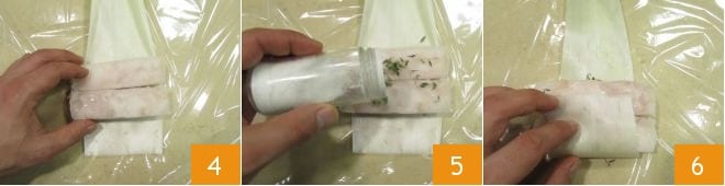 place the two cod fillets on the leaf 4, season with thyme leaves, salt 5, pepper, then roll the leaf around the fillets 6