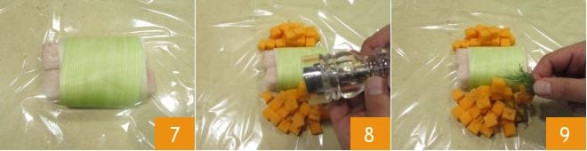 completely wrapping them and keeping the seam on the bottom 7. Place the roll in the center of the parchment paper, also add the pumpkin cubes on the sides, salt, pepper 8, and season with dill 9.