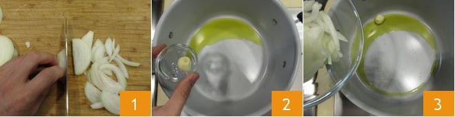 To make Livorno-style cod, start by preparing the sauce: clean and slice the onions 1, heat a drizzle of olive oil in a pan, add the whole peeled clove of garlic 2 and the onion slices 3.