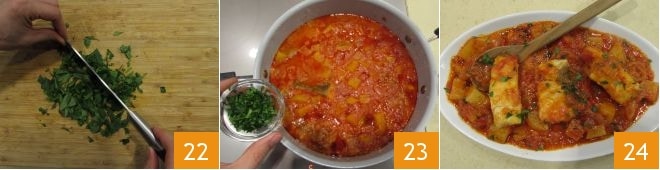 Wash and chop the bunch of parsley 22, once the cod is cooked, turn off the heat and flavor with the chopped parsley 23. Serve your Livorno-style cod piping hot 24.