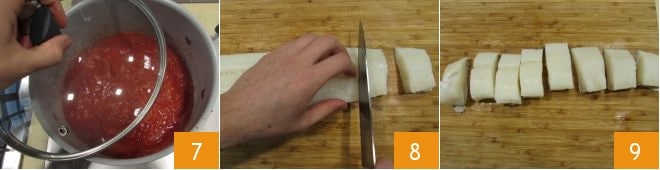 Cover with the lid 7 and cook over medium heat for about 15 minutes. Meanwhile, start cutting the desalted cod into chunks 8, trying to obtain pieces of the same size 9 (if you bought salted cod, you can desalinate it by following our instructions in the guide: How to desalinate cod).
