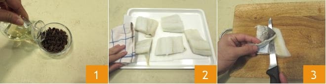 To prepare the cod terrine with apple sauce, start by rinsing the raisins under running water, then place them in a small bowl with the white wine 1: leave for at least 30 minutes. Then take the desalted cod (if you have salted cod, you can follow our cooking school: how to desalinate cod) and quickly rinse it under a stream of cold water, then pat it dry 2. Remove the fish skin with the sharp blade of a knife 3,