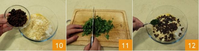 Add the raisins to the other ingredients 10. Finely chop the well-rinsed and dried parsley 11 and add it to the bowl as well 12.