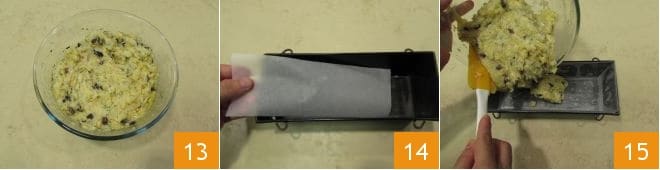Mix the ingredients well with a fork to obtain a homogeneous mixture 13. Now butter an 11x4 inch loaf pan with a height of 2.75 inches and line it with parchment paper 14: you can cut strips of parchment paper to the width and length of the pan's bottom and sides, so there are no uncovered spaces. Transfer the mixture obtained 15, leveling it with a spatula.