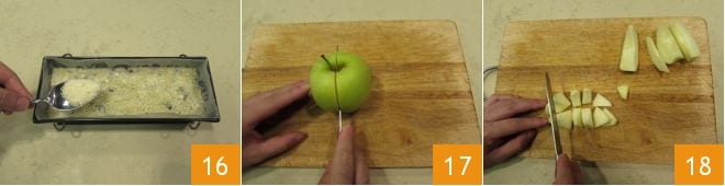 Sprinkle with the grated cheese 16 and bake in a static oven preheated to 340°F for 50-55 minutes (if using a fan oven, 300°F for 40-45 minutes will suffice). While the cod terrine is in the oven, focus on the apple sauce: cut them in half 17 and peel them. Cut them into wedges and then into cubes 18.