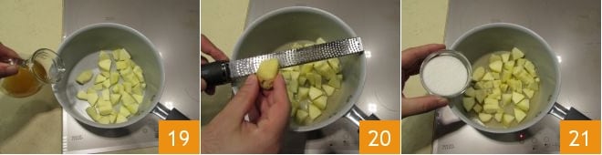 Place them in a non-stick pan and add the white wine you used to soak the raisins 19: let it evaporate over medium heat. When the wine has evaporated, peel the ginger with a vegetable peeler and grate the peel directly into the pan 20. Cook over moderate heat for a few minutes, then add the sugar 21.