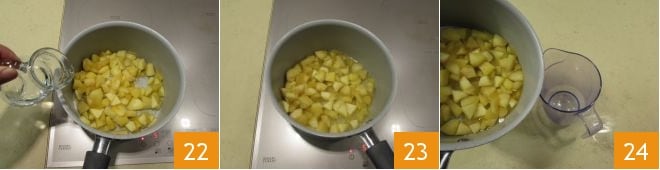 Add the water and let it cook for about a few minutes until the water is almost completely absorbed 23. Continue to stir to blend the ingredients and flavors. The apples at the end of cooking should be well cooked and very soft. Then transfer them to a narrow, high-sided container 24.
