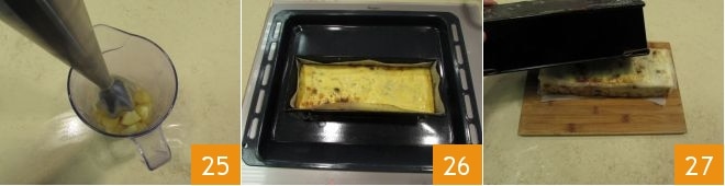 Blend them with an immersion mixer 25 and your apple sauce will be ready. Meanwhile, the cod terrine will also be ready (you can test the cooking with a toothpick) 26: unmold it by turning it upside down on a serving plate 27, being careful to gently remove the parchment paper as well.