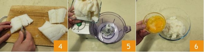 remove the bones 4 using kitchen tweezers and place it in the mixer 5 to blend. Transfer the minced cod to a large bowl to which you will add the beaten egg yolks 6.