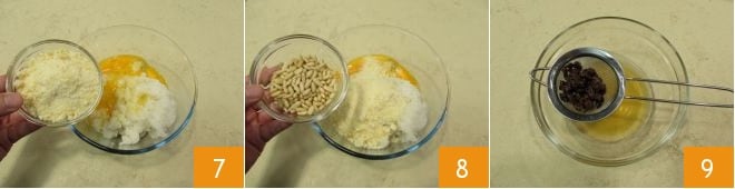 Also add the grated cheese 7 and pine nuts 8. Then drain the raisins and set the wine aside 9.