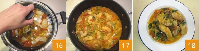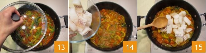 then cover with the lid 13 and cook over medium heat for about 20 minutes. After 20 minutes, add the cod 14 and stir gently to avoid breaking it 15.