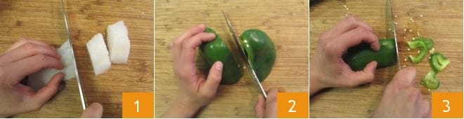 To prepare the cod with peppers, first cut the already desalted cod fillets into coarse pieces 1, then take care of the other ingredients needed for the recipe: cut the green pepper in half 2 and remove the seeds and inner filaments, then slice it into strips 3. Do the same with the other peppers: you will need a total of 150 grams (5.3 oz).