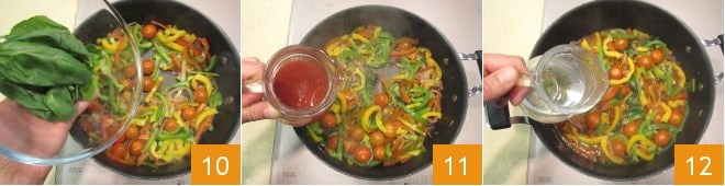 and the mint and basil leaves 10. Add a pinch of salt, pour in the wine with the tomato paste 11 and the water 12,