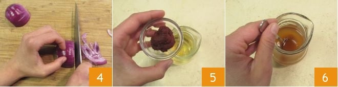 Clean the onion and slice it thinly 4. Pour the tomato paste into the white wine 5 and stir with a teaspoon to dissolve it completely 6. Leave the cherry tomatoes whole.