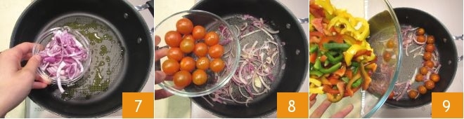 Now heat the oil in a saucepan, add the onion 7 and sauté briefly, then add the cherry tomatoes 8, the peppers 9,