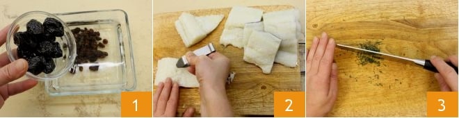 To prepare the cod with plums, raisins, and pine nuts, wash the raisins and soak them together with the plums for at least 10 minutes in a bowl filled with water 1, then drain them and set aside. In the meantime, take the already-soaked cod fillets and remove the bones with a special tweezers 2; if the cod hasn't been soaked, you'll need to desalinate it by placing it in a bowl full of cold water for a couple of days, taking care to change the water every 6 hours or so. Also chop the thyme leaves 3 and parsley and set aside, they will be used to flavor the dish.