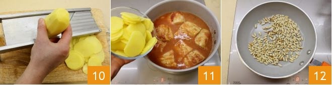 Peel the potatoes and slice them with a mandoline 10, they should be about 1/16 inch thick, as you cut them place them in a bowl with cold water to prevent them from browning; then add them to the cod and cook for another 30 minutes 11. Meanwhile, in a separate pan, toast the pine nuts 12.