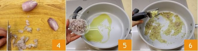 Peel the shallot, chop it finely 4, let it soften over low heat in a saucepan with a drizzle of oil 5 for 8-10 minutes, then add the chopped garlic 6.
