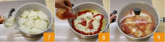 Add the cod fillets, chopped thyme, white wine 7 and cook for 5 minutes. Then pour in the tomato puree 8 and mix with a wooden spoon. Season with salt and pepper to your liking and cover with the lid 9, continuing to cook over moderate heat for another 20 minutes.