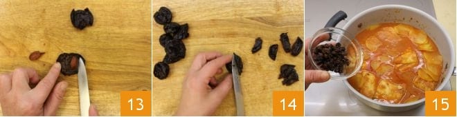 Cut the plums in half to remove the pit 13 and then slice them 14, after which add them to the cod with the raisins 15