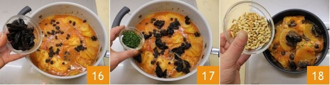 the plums 16 and the chopped herbs 17; continue cooking for another 5 minutes. Finally, plate the dish and garnish the cod with the toasted pine nuts 18.